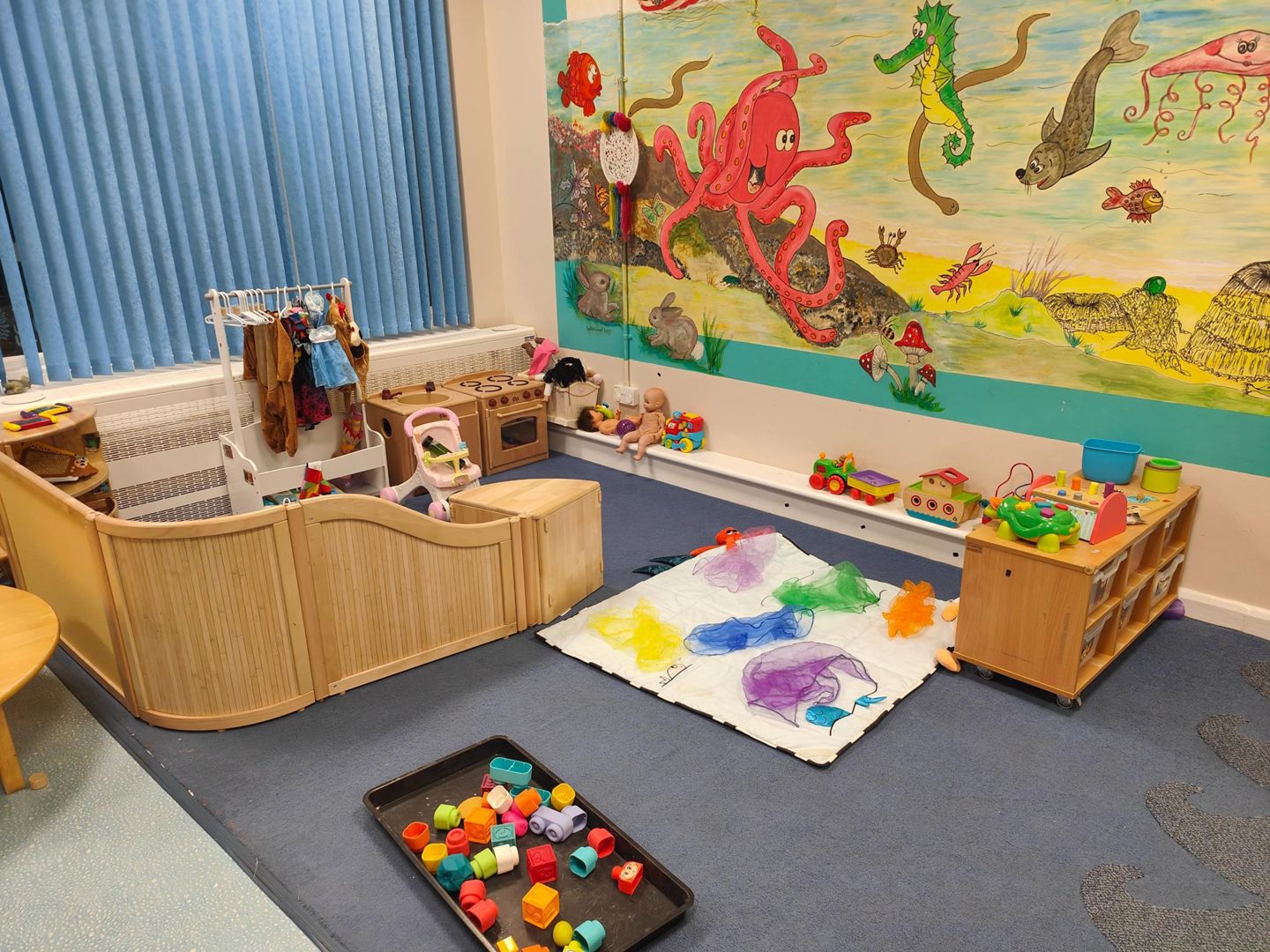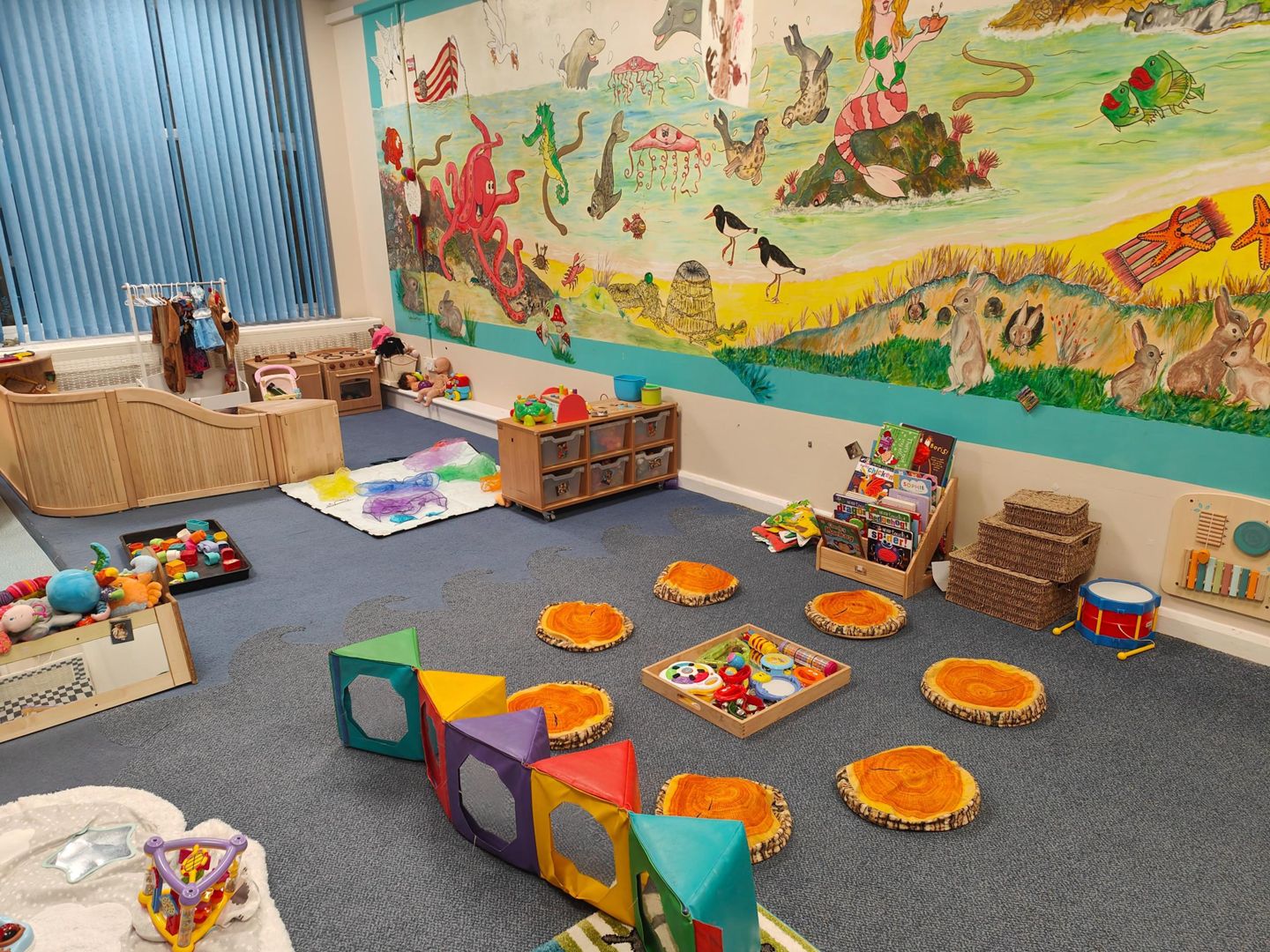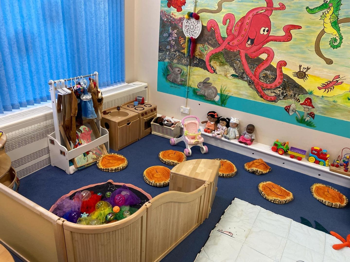 Barafundle has easy accessibility to the garden, with a door leading straight out to the outdoor area. There is a sink and miniature kitchen provided near the outdoor play entrance to maintain high standards of hygiene. One wall of this playroom shows scenes from Barafundle, in an ‘Under the Sea’, theme. The flooring of this room is comprised of carpet and non-slip flooring in the wet or messy play area.