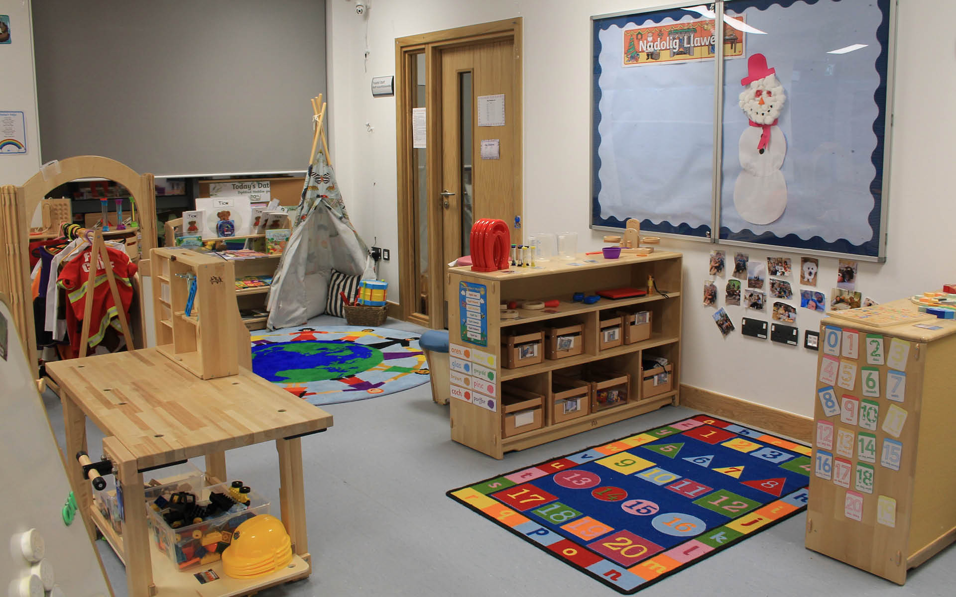 Mae ein hystafell chwarae yn ystafell chwarae fawr eang, sy'n rhoi cyfle i'r plant ddewis eu gweithgareddau chwarae trwy gydol y dydd. Mae gan yr ystafell fynediad i ardal laswellt gyda chegin fwd a gallwn gael mynediad at lwybrau cerdded trwy'r coed. Cynigiwn ofal a dysgu o safon uchel drwy’r Cwricwlwm i Gymru ac egwyddorion Gwaith Chwarae.